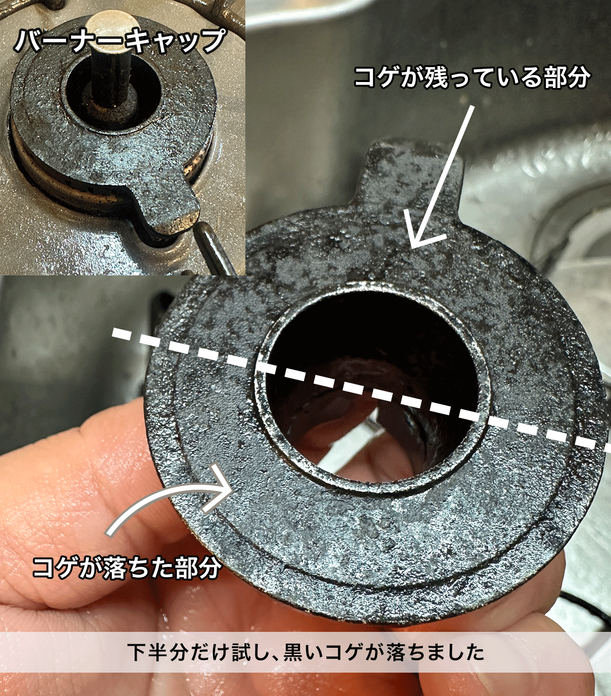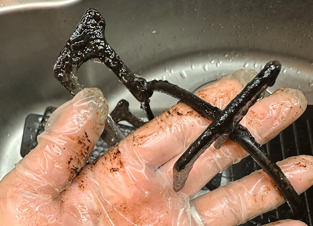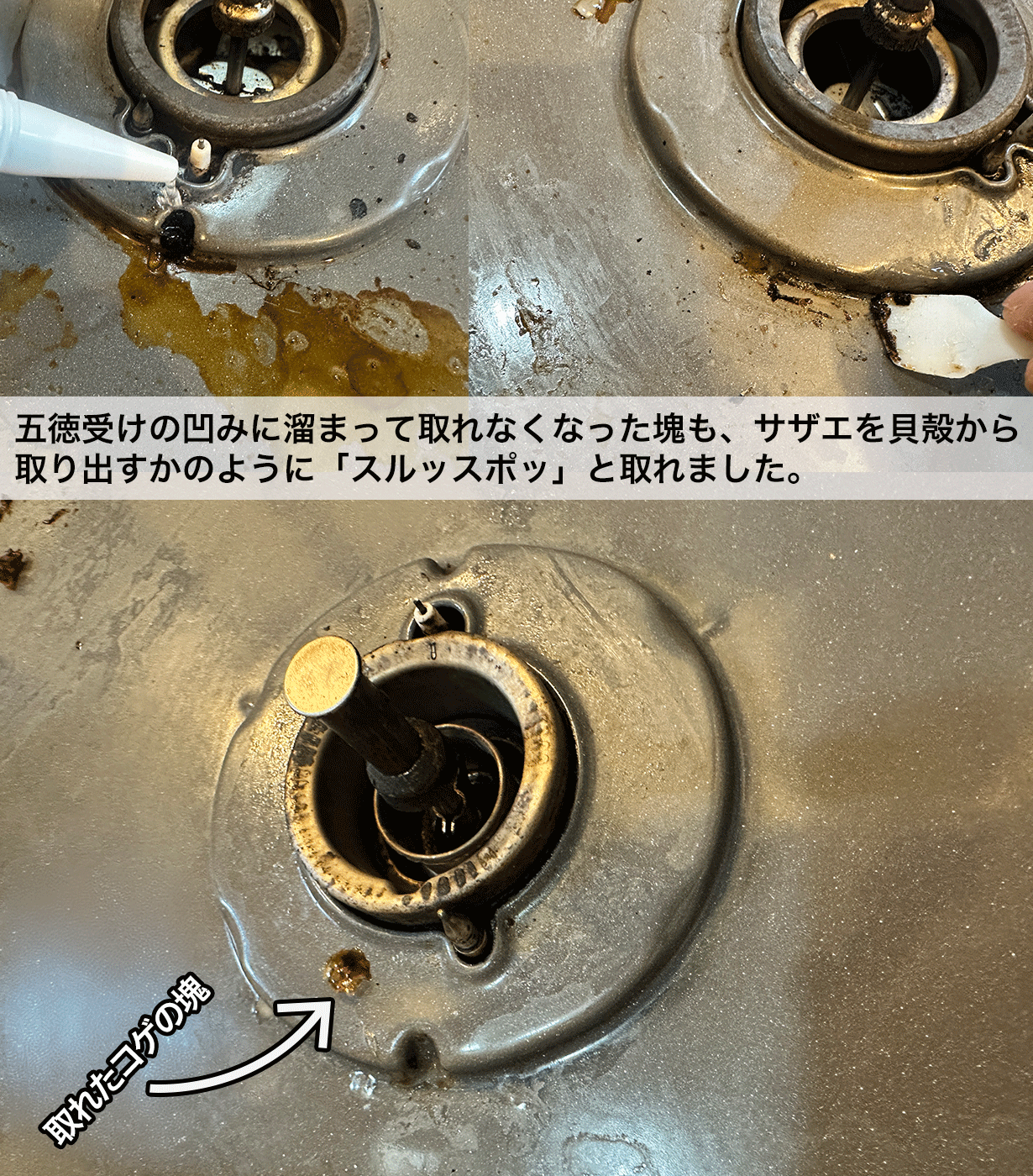五徳受けの凹みに溜まって取れなくなっていたものも、サザエを貝殻から取り出すときのように、まさに「ヌルッスポッ」と取れました。