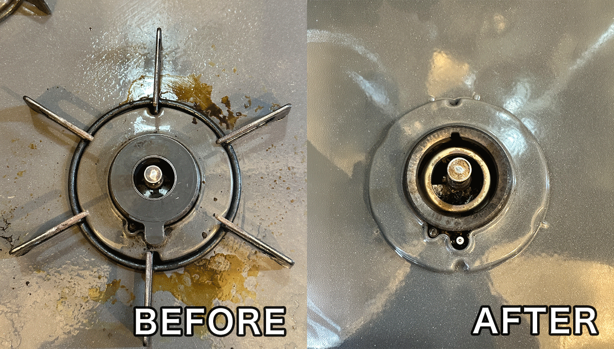網のようなステンレスには抜群に合います。受け皿のようなアルミには液が強いため、変色したり跡が残る場合があります。 こびりついた汚れを落とす場合、カーボンヘラが傷跡も残らず剥がれやすいです。手は最後素手で行いましたが、ガサガサにならず手に優しかったです。 本体ふち部分は、液をつけてハケで伸ばし、時間を置くことなくセスキのシートで拭き上げました。